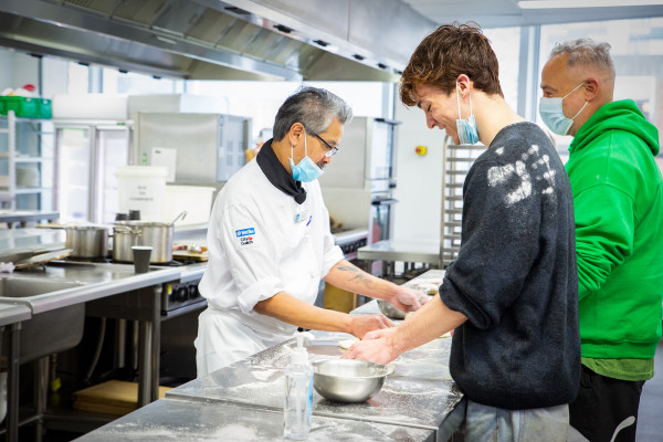 Visitors making flatbreads with tutor Robert Bok at WelTec's School of Hospitality on Cuba Street, Wellington